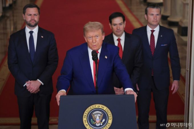 [워싱턴=AP/뉴시스] 도널드 트럼프 미국 대통령이 21일(현지 시간) 백악관 이스트룸에서 미군의 이란 핵 시설 공습에 관해 발언하고 있다. 트럼프 대통령은 "이란의 핵 프로그램에 대한 선제적 조치로, 정밀 타격이 성공적으로 이루어졌다"라고 밝혔다. 이 자리에는 JD 밴스 부통령, 마코 루비오 국무장관, 피트 헤그세스 국방장관이 배석했다. 2025.06.22. /사진=민경찬