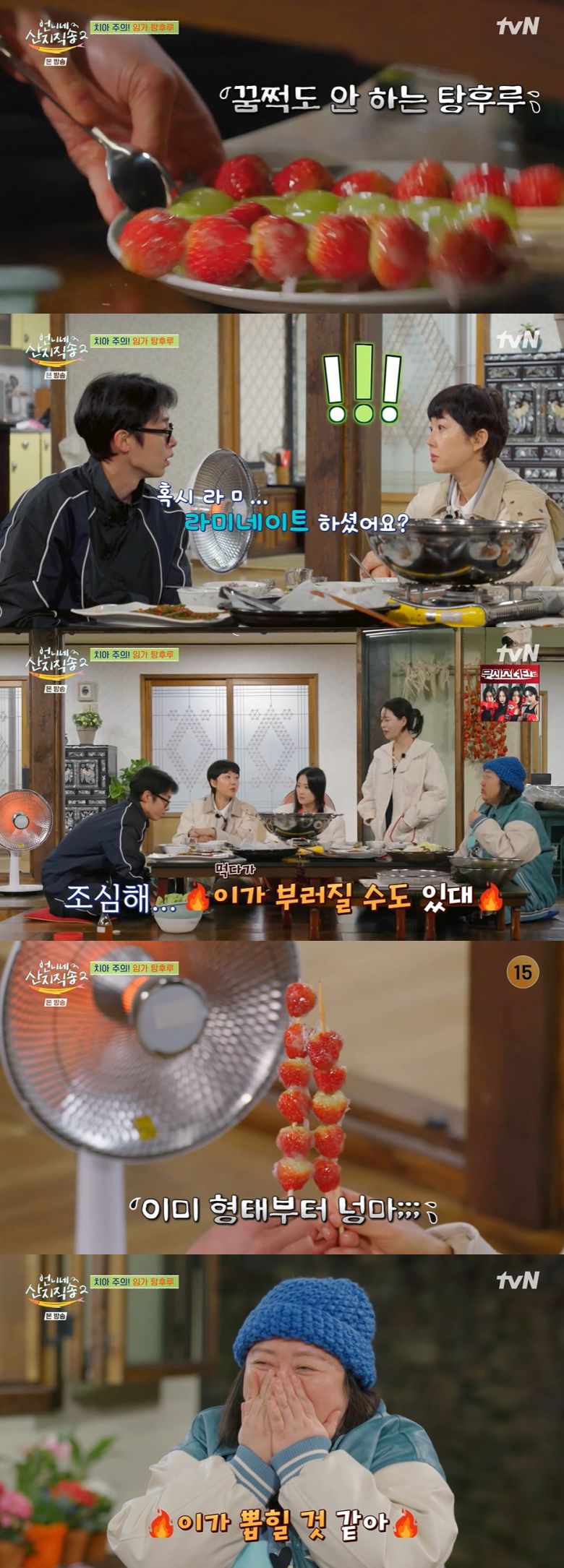 앞서 임지연은 직접 탕후루를 만들어 냉장고에 넣어놨는데, 임지연의 탕후루를 그릇에서 떼어내던 이재욱은 염정아에게 "혹시 라미네이트 하셨어요? 한 사람은 안 먹는 게 좋을 수도 있을 것 같다. 수저가 안 들어간다"라고 말했다.