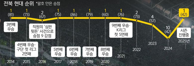 2024시즌 K리그1에서 전북 현대는 창단 후 첫 승강 플레이오프까지 치르는 수모를 겪었다. 2014시즌부터 2022시즌까지 9시즌 동안 7차례 우승과 2차례 준우승을 차지하는 등 K리그1 최다 우승(9회)에 빛나는 ‘축구명가’ 자존심을 구긴 것이다. 2025시즌을 앞두고 전북은 한국 축구대표팀 새 사령탑으로 거론되던 거스 포옛(58·우루과이) 감독을 새롭게 영입하며 칼을 갈았고, 서서히 리그에 적응하던 포옛 감독은 다시 전북을 K리그 최강팀으로 만들어놨다.