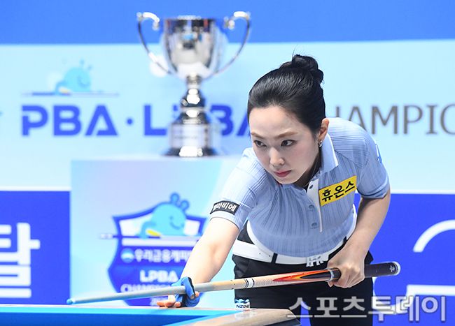 [고양(경기)=스포츠투데이 팽현준 기자] 22일 경기도 고양 킨텍스 PBA 스타디움에서 열린 2025-26시즌 개막전 '우리금융캐피탈 PBA-LPBA 챔피언십 2025' LPBA(여자부) 김가영과 차유람의 결승, 차유람이 샷을 하고 있다. 2025.06.22.