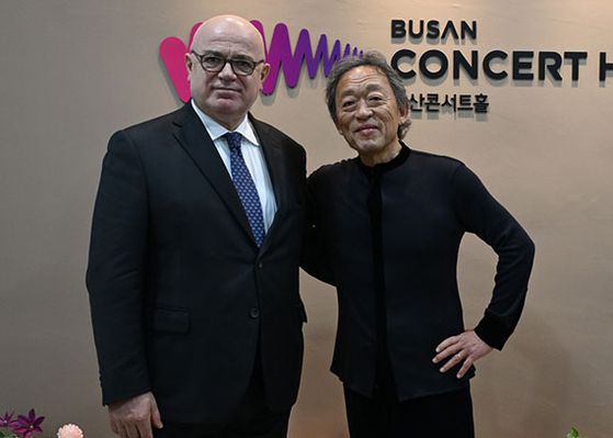 22일 부산콘서트홀에서 함께 포즈를 취한 정명훈 예술감독(오른쪽)과 라 스칼라 극장의 오르톰비나 극장장. 정 감독은 2027년 라 스칼라 음악감독으로 부임한다. [사진 부산콘서트홀]
