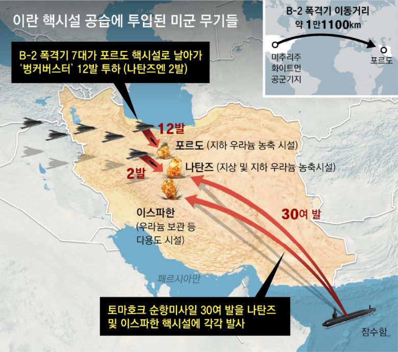 뉴욕타임스(NYT) 등에 따르면 미군의 B-2 스텔스 폭격기 7대는 이날 미국 미주리주 화이트먼 공군기지에서 논스톱으로 이란까지 날아가 핵시설 3곳을 집중 타격했다. 이 기지에서 이란 포르도, 나탄즈, 이스파한 핵시설까지의 직선거리는 각각 1만1100km, 1만1200km, 1만1302km다. 수차례 공중급유를 받아가며 18시간 동안 쉬지 않고 날아가 임무를 완수한 것.