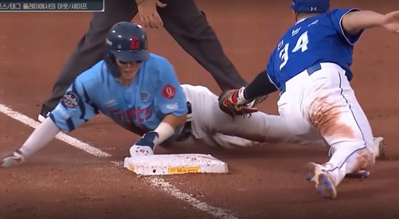 결국 고승민은 전병우의 글러브가 자신에게 닿기 전 왼손으로 먼저 베이스를 찍는 데 성공했다. 슬라이딩해 몸이 앞으로 밀리며 왼손이 베이스에서 떨어지자 재빨리 왼발로 베이스를 터치했다. 고승민의 발이 떨어졌을 때 전병우가 태그를 시도했지만 고승민의 몸이 아닌 땅을 찍은 것으로 보였다.