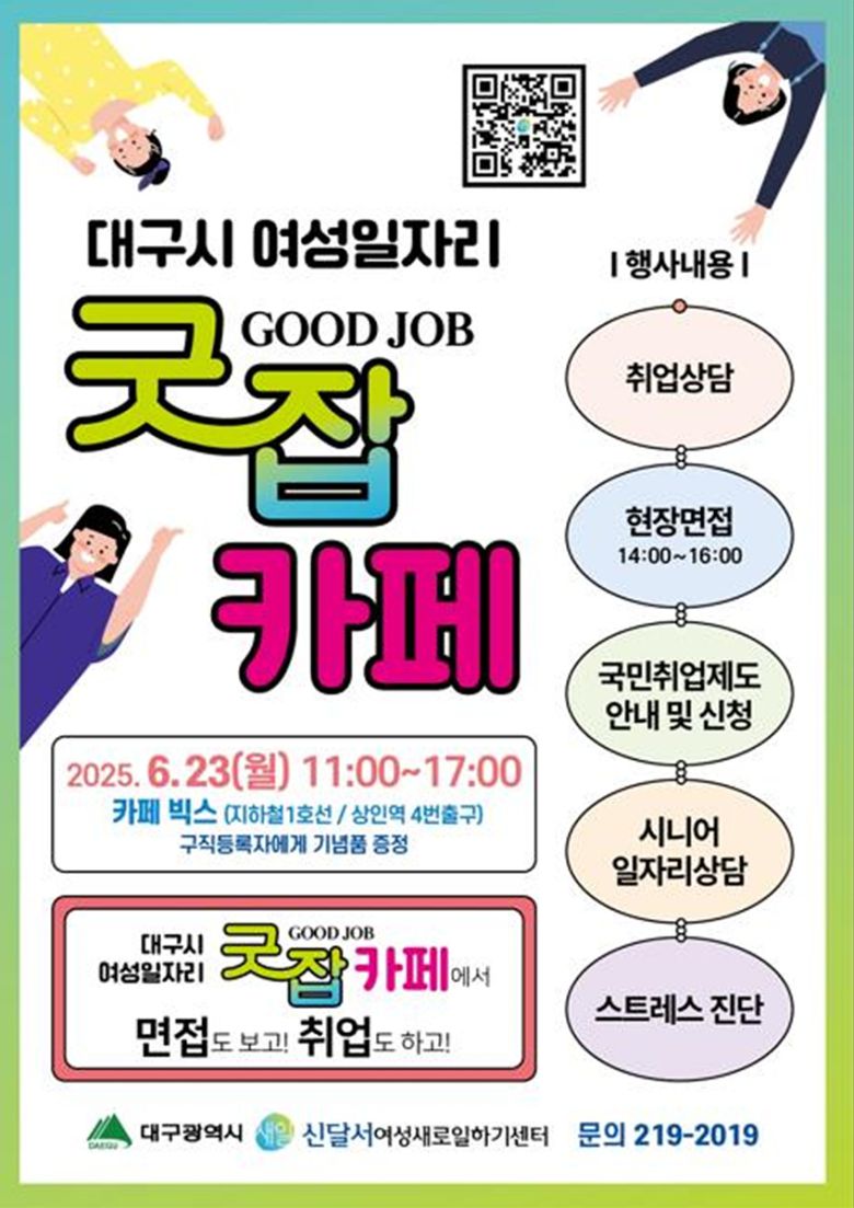 [헤럴드경제(대구)=김병진 기자]대구시는 취업을 희망하는 경력단절 및 미취업 여성을 위해 ‘찾아가는 여성일자리 ‘굿잡(Good Job)’카페’ 행사를 23일 오전 11시부터 카페 빅스(도시철도 1호선, 상인역 4번출구)에서 운영한다.