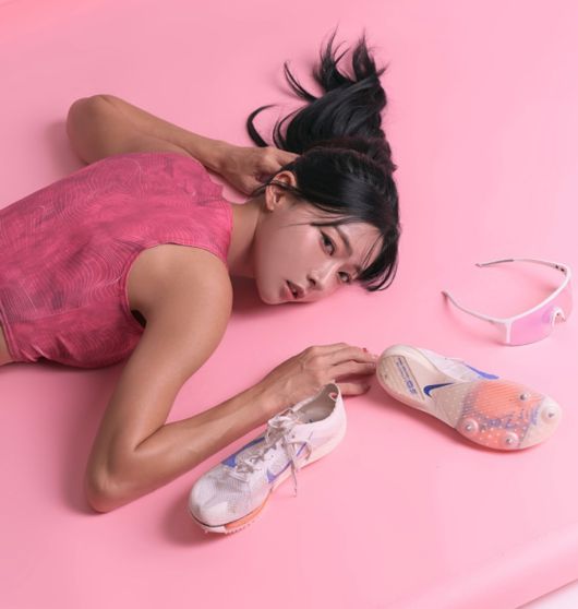 공개된 사진에는 김민지가 진행한 화보가 담겼다. 진한 분홍색 스포츠탑을 입은 그는 고글과 러닝화가 떨어진 바닥에 엎드려 일어나려는 듯 팔을 짚고 스포티걸 콘셉트를 소화했다.