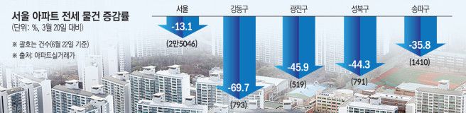 22일 부동산 플랫폼 ‘아파트실거래가’ 통계 분석 결과 최근 3개월(4월 22일~6월 22일) 기준 서울 아파트 전체 전세 물건은 2만8828건에서 2만5127건으로 12.9% 줄었다. 주요 자치구 별로는 강동구가 2613건에서 816건으로 68.8%나 급감해 감소율 1위를 기록했다. 이어서 광진구는 959건에서 527건으로 45.1% 줄었고 성북구(-43.1%)와 송파구(-35.7%)가 그 뒤를 이었다.