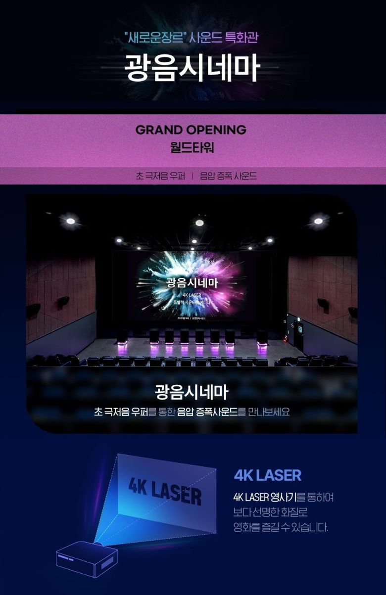 이번 ‘광음시네마’ 오픈으로, 핵심 플래그십 상영관인 롯데시네마 월드타워는 ▲국내 최대 스크린, 돌비 애트모스 사운드, 프리미엄 좌석을 갖춘 PLF 상영관 ‘수퍼플렉스’, ▲국내 최초 글로벌 4D 시스템을 도입한 ‘수퍼|MX4D’, ▲국내 최초 LED 스크린과 무한대 명암비의 ‘수퍼LED’, ▲전 좌석 리클라이너를 갖춘 프리미엄 상영관 ‘샤롯데’ 상영관을 모두 갖추게 되었다.