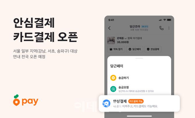 [이데일리 김아름 기자] 국내 대표 지역생활 커뮤니티 당근의 자체 간편결제 서비스 당근페이가 안심결제 서비스에 ‘카드 결제’ 기능을 도입했다고 23일 밝혔다. 이번 기능 도입으로 이용자는 결제 방식 선택의 폭이 넓어져, 보다 안전하고 편리한 중고거래가 가능할 것으로 기대된다.