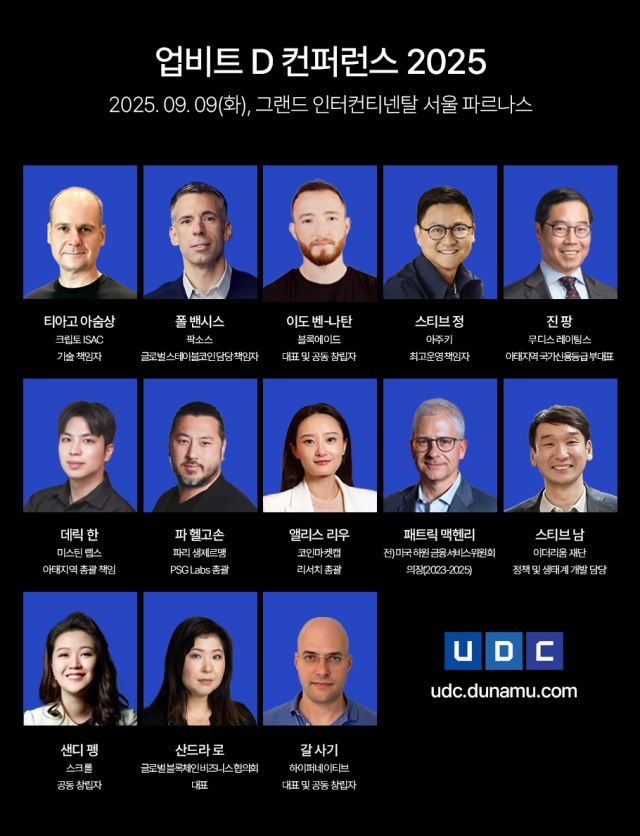 23일 두나무에 따르면, 이번에 공개된 UDC 2025 1차 연사 라인업에는 글로벌 정책, 스테이블 코인, 크립토 결제…, AI, 보안 등 최근 디지털 자산과 블록체인 업계의 변화를 주도하고 있는 각 분야 전문가들이 대거 포진했다.