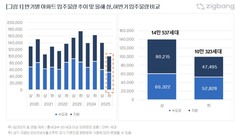 23일 직방 조사에 따르면 올해 하반기에는 전국 총 10만323가구가 입주할 예정이다. 이는 올해 상반기(14만537가구)보다 29% 적고, 전년 동기간인 2024년 하반기(16만3977가구) 대비 39% 감소한 물량이다.