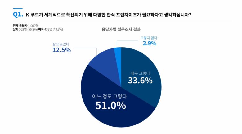 ‘K-푸드 확산을 위해 다양한 한식 프랜차이즈가 필요하다고 생각하는가’라는 질문에는 전체 응답자의 84.6%가 긍정적으로 답했다. 이 중 ‘매우 그렇다’는 응답이 33.6%, ‘어느 정도 그렇다’는 응답이 51.0%로, 한식 프랜차이즈 확대에 대한 기대감이 드러났다.