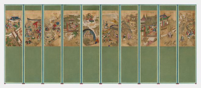 구운몽도 병풍은 김만중이 쓴 소설 '구운몽'의 주요 장면을 10폭에 담은 작품이다. 성진이 팔선녀를 만나는 장면부터 양소유로 환생해 부귀영화를 누리는 내용까지, 인간의 욕망과 깨달음을 그려낸 철학적 메시지가 담겨 있다.