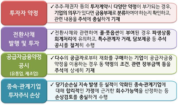 우선 금감원은 주주·채권자 등 투자 계약 시 다양한 약정이 부가되는 사례에 대해 필요한 부분을 금융 부채로 분류하는지 확인하고 관련 내용을 주석에 충실하게 기재하는지 확인할 예정이다. 금융 부채를 미인식하거나 풋옵션이나 약정 위반 주석 등을 빠뜨리는 사례가 다수 발생한 데 따른 조처다.