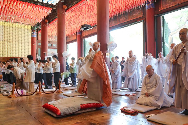 [서울=뉴시스] 대한불교조계종 총무원장 진우스님이 23일 서울 종로구 조계사 대웅전에서 열린 취임 1000일 '세상의 평안을 위한 1천일 기도 회향' 법회에서 108배를 하고 있다. (사진=대한불교조계종 제공) 2025.6.2 *재판매 및 DB 금지