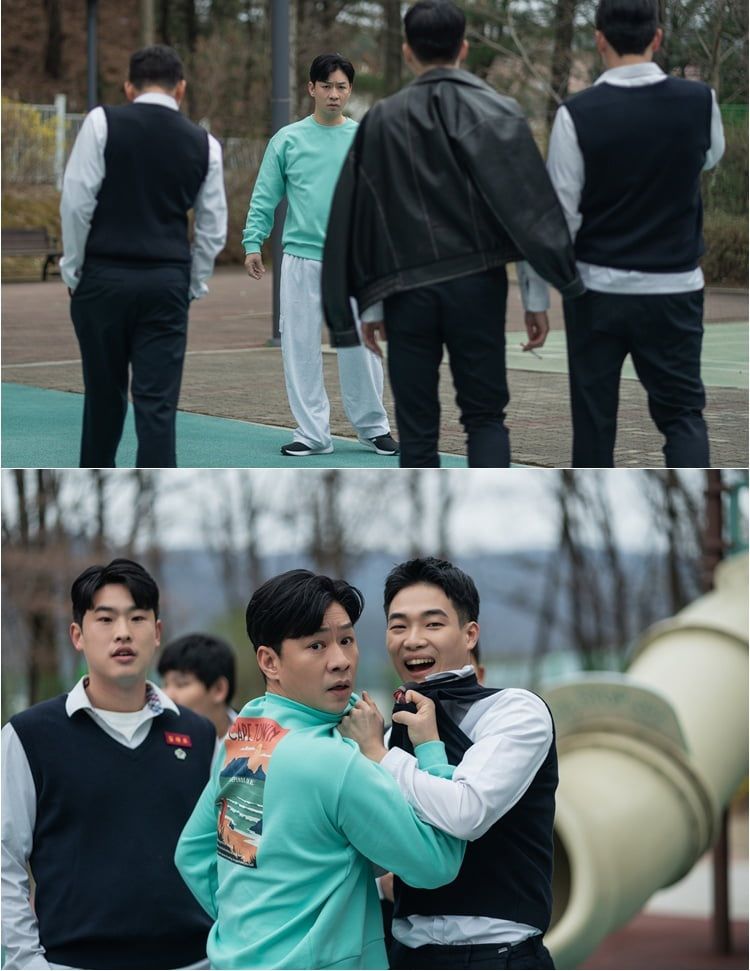 공개된 스틸 속 승호는 학폭빌런들의 불량한 행실을 목격하고 단속에 나선 듯한 모습이다. 마치 고독한 전투를 치르기 위해 흙먼지를 일으키며 걸어오는 서부영화 속 주인공 같은 승호의 비장한 자태가 깨알 웃음을 자아낸다. 그도 잠시, 승호의 압도적 승리로 끝날 줄 알았던 상황이 쌍방 실랑이가 되어버린 모습. 무엇보다 까마득하게 어린 학생에게 멱살을 잡힌 뒤 동공지진을 일으키는 승호와는 달리, 불량 학생은 타격감이 전혀 없다는 듯 파안대소를 터뜨리고 있어 승호의 굴욕적인 판정패를 예감하게 한다.
