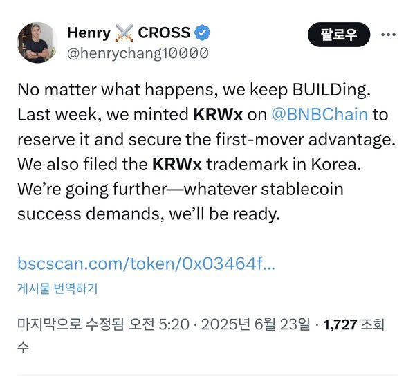 넥써쓰(대표 장현국)가 원화 스테이블코인 'KRWx'의 국내 상표를 출원하고 BNB 체인에 발행했다.