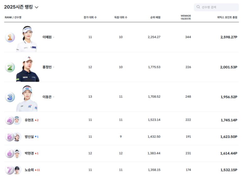 금주 위믹스 포인트 TOP5 랭킹은 1위 이예원(2,598P), 2위 홍정민(2,001P), 3위 이동은(1,956P), 4위 유현조(1,745P), 5위 방신실(1,623P)이다. 선수별 보다 자세한 순위는 위믹스 포인트 랭킹 홈페이지(https://wemix.golf.sbs.co.kr/point)를 통해 확인할 수 있다.