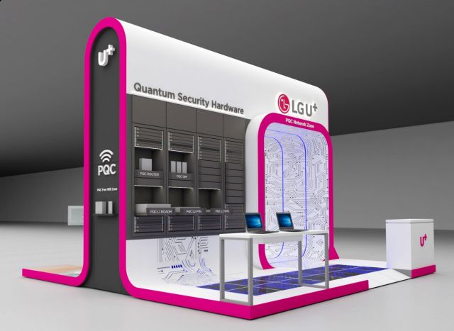 전시부스는 사무실과 원격근무지를 각각 표현한 양면 구성으로 설계됐다. LG유플러스의 U+PQC VPN과 클라우드 기반 서비스를 통해 언제 어디서나 안전한 업무환경을 구축할 수 있다는 메시지를 전달한다.