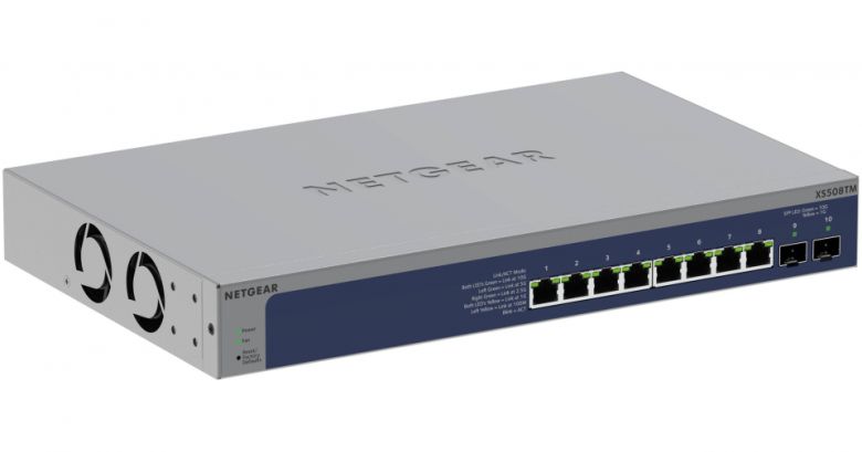 넷기어 XS508TM 스위치 허브는 8개의 10G 멀티 기가비트 이더넷 포트 & LED, 2개의 10G SFP+ 광 포트를 갖춘 제품이다. 포트에 있는 LED 색상에 따라 현재 연결된 네트워크 속도가 100Mbps/1Gbps/2.5Gbps/5Gbps/10Gbps 중 어떤 것인지 알 수 있다.