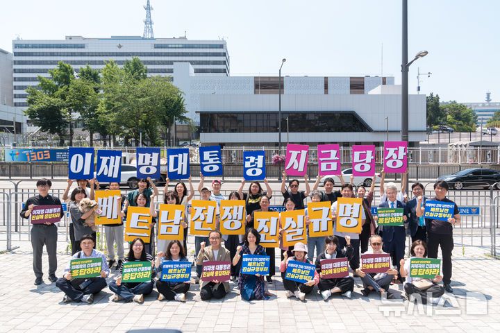 [서울=뉴시스] 23일 오전 서울 용산구 대통령실 앞에서 열린 대통령실 면담 내용 브리핑이 끝나고 피해생존자와 시민단체 사람들이 피케팅을 진행하는 모습이다. (사진=한베평화재단 제공) 2025.06.23. photo@newsis.com