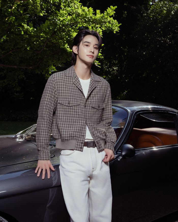 정우는 체크 패턴의 크롭 재킷과 아이보리 데님 팬츠에 벨트로 구성된 정제된 감각의 컨템포러리 룩을 착용해 고급스러우면서도 현대적인 세련미를 뽐냈다.