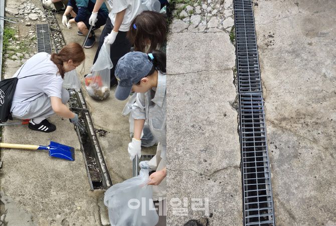 지난 21일 오전 서울 관악구 신사동 주택가에서 시민들이 모여 빗물받이를 막은 담배꽁초와 쓰레기를 치우고 있다(왼쪽). 이들이 청소한 하수구가 깨끗해진 모습. (사진=정윤지 기자) |