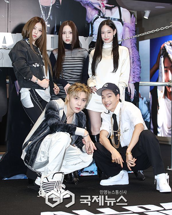 (서울=국제뉴스) 이대웅 기자 = 혼성그룹 올데이 프로젝트(ALLDAY PROJECT) 베일리, 타잔, 영서, 우찬, 애니가 23일 오후 서울 강남구 LG유플러스 일상의틈에서 열린 데뷔 싱글 '페이머스(FAMOUS)' 발매 기념 팝업 스토어 행사에 참석해 포즈를 취하고 있다.