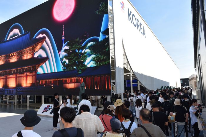 오사카엑스포에 설치된 한국관에 입장하기 위해 관람객들이 긴 줄을 서며 대기하고 있다.[KOTRA] |