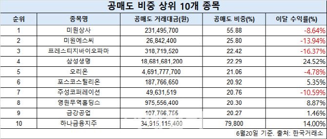 이 밖에도 바이오 기업인 프레스티지바이오파마(22.4%), 보험업종 대형주인 삼성생명(22.3%), 식품 업종의 오리온(21.6%), 철강주 포스코스틸리온(20.9%) 등 다양한 업종에서 공매도 상위 종목이 등장했다. 특정 섹터에 한정되지 않고 전방위적인 매도세가 나타나는 모습이다.