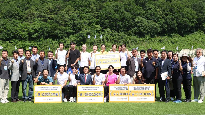 ▲ 대한육상연맹이 23일 강원 정선종합운동장에서 2025 구미 아시아선수권 메달리스트와 한국 신기록을 작성한 선수, 지도자들에게 포상금을 지급하고, 기념 촬영을 하고 있다.