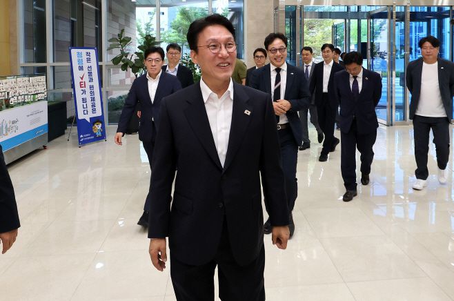 김민석 국무총리 후보자가 지난 20일 대구 수성구 대구디지털혁신진흥원에서 열린 '인공지능 전환(AX) 연구거점 조성을 위한 경청 간담회'에 참석하기 위해 이동하고 있다. /연합