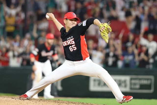 KIA 성영탁이 21일 인천 SSG랜더스필드에서 열린 SSG와 원정 경기에 구원 등판해 역투하고 있다. 데뷔 후 17.1이닝 연속 무실점 행진 중인 성영탁은 앞으로 2.2이닝을 실점 없이 더 막으면 2024년 키움 김인범(19.2이닝)을 넘어 신기록을 작성한다. KIA 제공