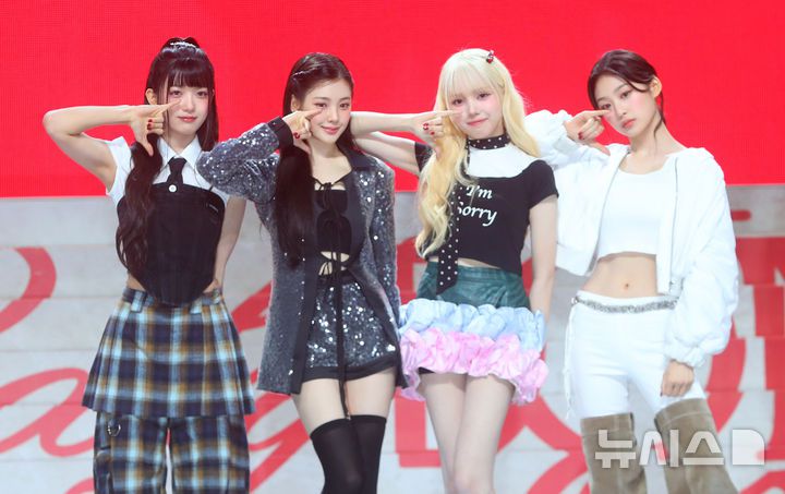 [서울=뉴시스] 김혜진 기자 = 그룹 베이비돈크라이(왼쪽부터 쿠미, 이현, 미아, 베니)가 23일 오후 서울 용산구 블루스퀘어에서 열린 첫 번째 데뷔 싱글 앨범 '에프 걸(F Girl)' 발매 기념 쇼케이스에서 포즈를 취하고 있다. 2025.06.23. jini@newsis.com |