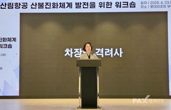 이미라 산림청 차장이 23일 산림항공 산불진화체계 발전을 위한 워크숍에서 격려사를 하고 있다. [사진제공=산림청][대전=팍스경제TV] 산림청은 충청남도 부여군에 위치한 롯데리조트부여에서 이미라 산림청 차장을 비롯한 산림항공본부 직원 260여 명이 참가한 가운데 2025년 영남권 대형산불 진화 경험을 공유하고 산불 진화체계 발전 방향을 논의하는 자리를 가졌다고 오늘(23일) 밝혔습니다.