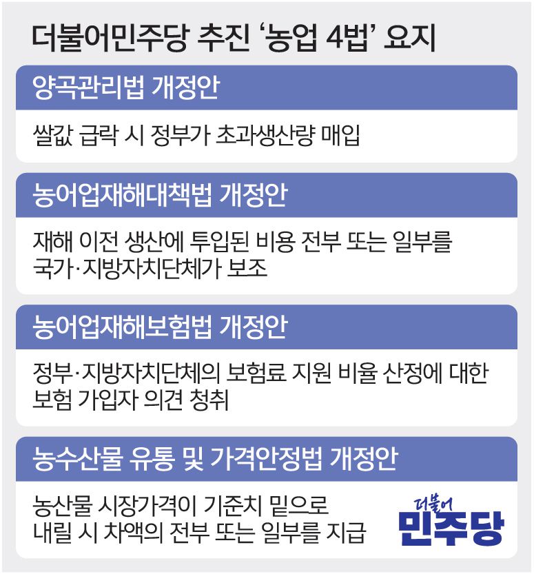 윤석열 전 대통령이 재의요구권(거부권)을 행사해 입법이 좌절됐던 농업 4법 추진도 본격화했다. 쌀값이 폭락할 경우 정부가 초과생산량을 매입하는 양곡관리법 개정안이 대표적이다. 이밖에 농수산물 유통 및 가격안정에 관한 법률 개정안과 농어업재해대책법·농어업재해보험법 개정도 재추진된다. 여당 주도로 재발의된 이들 법안은 이날 농림축산식품해양수산위원회 전체회의에서 소위로 회부됐다.