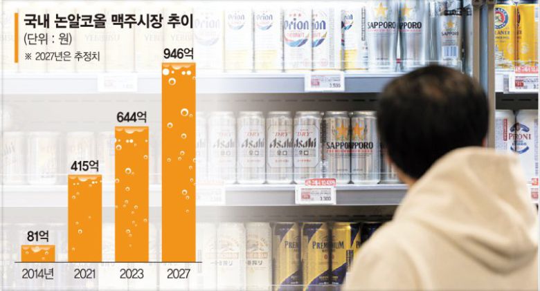 23일 시장조사업체 유로모니터에 따르면 국내 논알코올 맥주 시장은 오는 2027년까지 946억원 규모로 확대될 것으로 전망된다. 국내 논알코올 맥주 시장은 지난 2021년 415억원에서 2023년 644억원으로 55.2% 급성장하기도 했다.