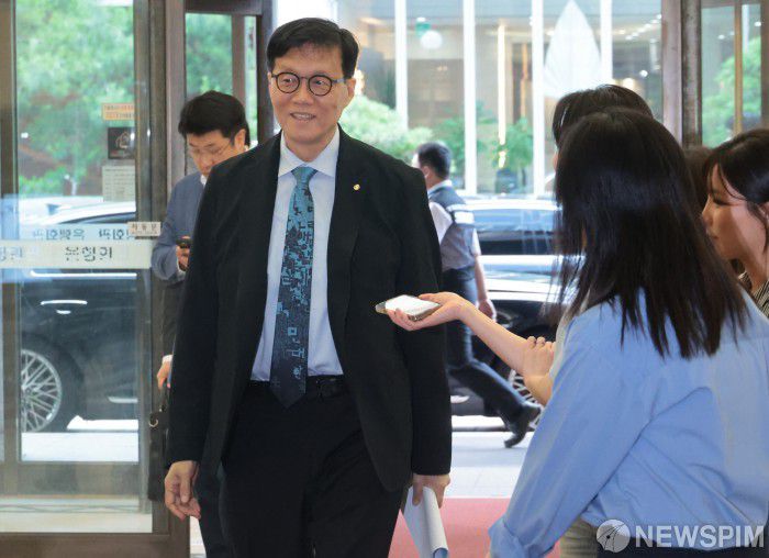 [서울=뉴스핌] 이길동 기자 = 이창용 한국은행 총재가 23일 오후 서울 중구 은행회관에서 은행장들과 가계대출과 가상자산 등 금융 현안을 논의하기 위해 간담회장으로 향하며 취재진의 질문에 답하고 있다. 2025.06.23 gdlee@newspim.com
