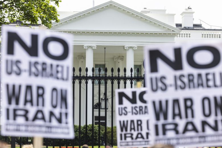 시위대가 22일 미국 워싱턴디시(D.C.) 백악관 앞에서 도널드 트럼프 미국 대통령의 이란 내 핵시설 폭격 결정에 반대하는 목소리를 내고 있다. 워싱턴/EPA 연합뉴스