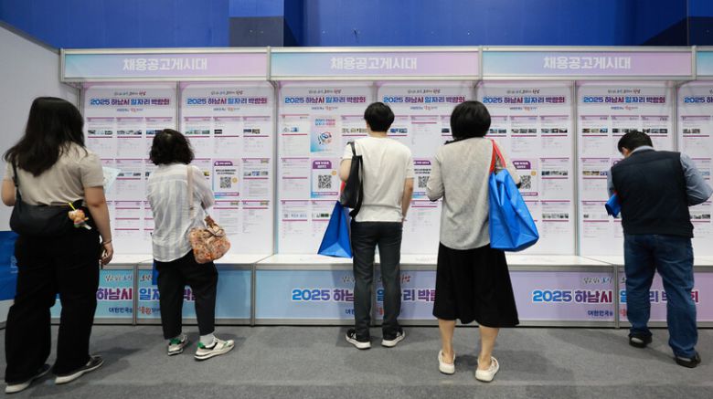통계청이 ‘5월 고용동향’을 발표한 지난 11일 경기도 하남종합운동장 제2체육관에서 열린 2025 하남시 일자리박람회에서 구직자들이 채용공고 게시대를 살피고 있다. 연합뉴스 |