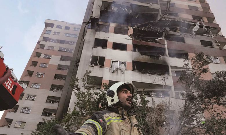 지난 6월 13일(현지시각) 오전 이스라엘 공군의 공습으로 파괴된 이란 수도 테헤란의 아파트에 출동한 소방대원이 동료에게 도움을 요청하고 있다. /사진 AP연합 |