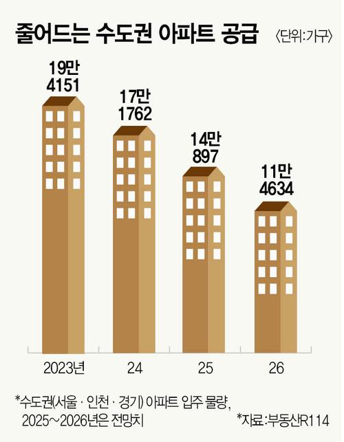 부동산R114에 따르면, 올해 서울·인천·경기 등 수도권 아파트 입주 물량은 14만897가구에 그칠 전망이다. 지난해 수도권에서 17만1762가구가 집들이한 것과 비교하면 3만865가구(18%) 적은 규모다. 내년에는 입주 물량이 11만4634가구로 더 급감한다.