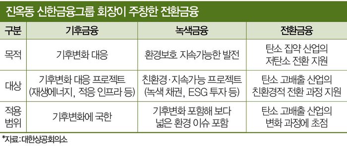 진옥동 신한금융 회장이 제시한 ‘전환금융(Transition Finance)’도 주목받는다. 전환금융은 탄소 배출이 많은 철강, 석유화학 등 전통적인 ‘굴뚝 산업’이 저탄소·친환경 구조로 바뀌는 과정을 금융이 지원한다는 의미다. 환경을 오염시키는 사업 활동을 줄이고 친환경적인 사업 활동으로 전환하도록 돕기 위해서다.