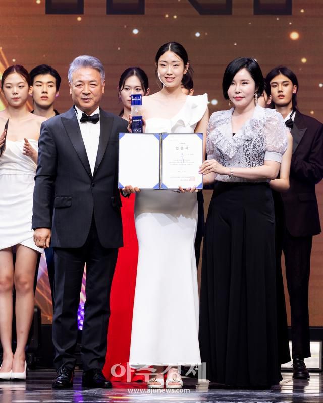 김지안과 아시아모델페스티벌 양의식 회장, 룩스BB 윤민영 디자이너가 기념촬영을 하고 있다.
