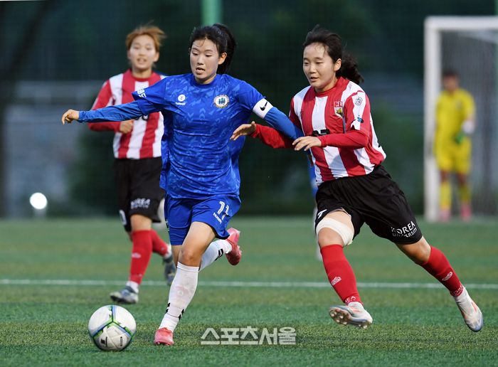 강원도립대 김하진(왼쪽)이 23일 경남 합천에서 열린 ‘2025 스포츠케이션 명품도시 합천에서 펼쳐지는 제33회 여왕기 전국여자축구대회’ 대학부 세종고려대와 경기에서 세종고려대 정지원의 수비를 피해 드리블을 하고 있다. 2025. 6. 23.