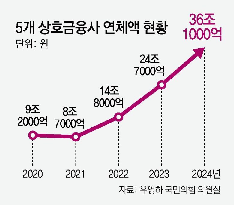 23일 유영하 국민의힘 의원실에 따르면 5개 상호금융사(MG새마을금고, 신협, 농협, 수협, 산림조합)의 지난해 연체액은 36조1000억 원으로 나타났다. 2020년 9조2000억 원, 2021년 8조7000억 원으로 다소 줄어들었다가 2022년 14조8000억 원으로 급증한 이후 2023년 24조7000억 원으로 빠르게 늘고 있는 추세다. 고금리 장기화 여파에 따른 경기 부진과 프로젝트 파이낸싱(PF) 부실 등의 영향인 것으로 풀이된다.