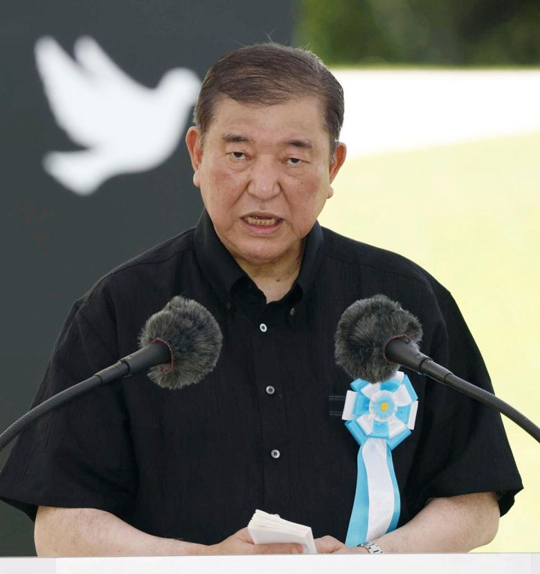 이시바 시게루 일본 총리가 23일 오키나와섬 이토만 공원에서 제2차 세계대전의 희생자들을 애도하는 연설을 하고 있다. 이토만=AP 뉴시스 |