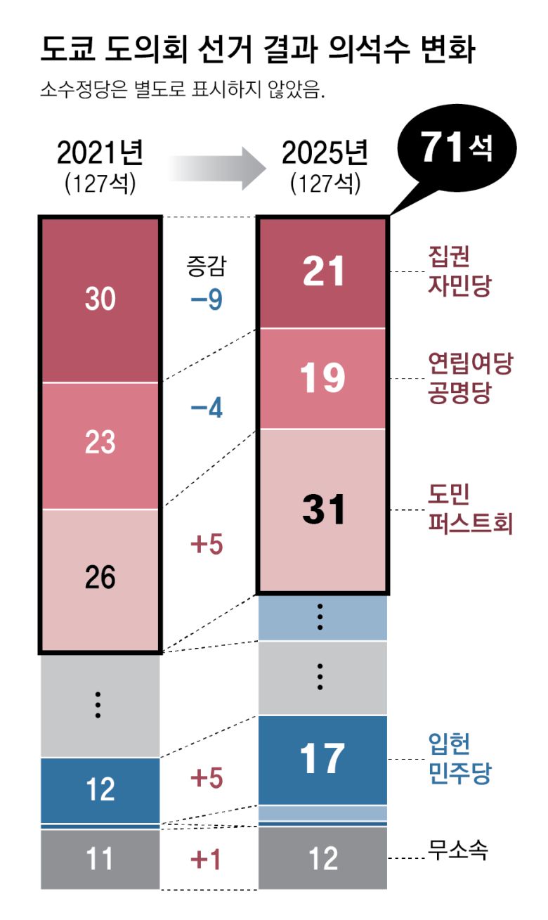 일본 집권 자민당이 22일 도쿄도의회 선거에서 역대 최저인 21석을 얻는 데 그치자 일본 언론은 이런 평가를 내놨다. 도의회의 총 의석수가 127석인 것을 감안하면 자민당은 전체의 16.5%(21석)밖에 얻지 못한 것이다. 현재 연립정권을 구성하고 있는 공명당이 확보한 의석(19석)을 합해도 31.4%에 그쳤다. 당장 다음 달 20일 참의원 선거가 예정돼 있다. 지난해 중의원 과반 확보 실패에 이어 이번 도의회 선거 참패로 2연패를 당한 이시바 시게루(石破茂) 정권이 지난해 10월 출범 후 최대 위기를 맞았다는 평가가 나온다.
