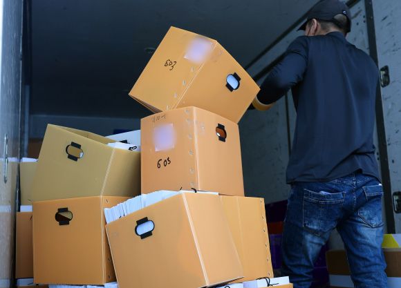 옮겨지는 내란 사건 자료들 - 23일 오전 내란 특검 사무실이 있는 서울 서초구 서울고검에서 관계자들이 12·3 내란 사건 관련 자료들을 차량으로 옮기고 있다. 내란 특검은 이날 여인형 전 국군방첩사령관 등 공소 제기 사건 자료 일부를 군검찰로 넘겼다. 뉴스1 |