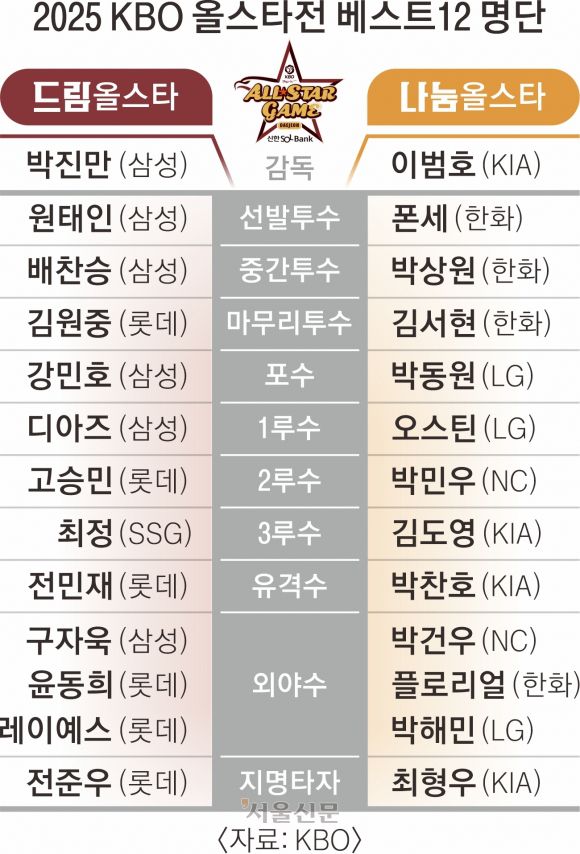 이범호 KIA 감독이 이끄는 나눔 올스타에선 한화가 코디 폰세(선발 투수), 박상원(중간 투수), 에스테반 플로리얼(외야수)까지 4명의 올스타를 배출했다. KIA에선 지난해 최고령 올스타전 최우수선수(MVP) 기록을 쓴 최형우가 올해도 지명타자 출전을 확정했고, 김도영(3루수)과 박찬호(유격수)가 2년 연속 베스트12에 포함됐다.