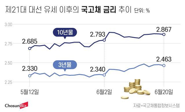 30조원 규모의 추가경정예산안으로 약 20조원의 추가 국채 발행이 예고된 가운데, 시장에선 국채금리의 향방에 주목하고 있다. 국채금리가 오르면 정부의 이자 부담이 커지는 것은 물론 시중금리의 연쇄 상승을 이끌며 기업들의 자금 조달 비용도 커진다.